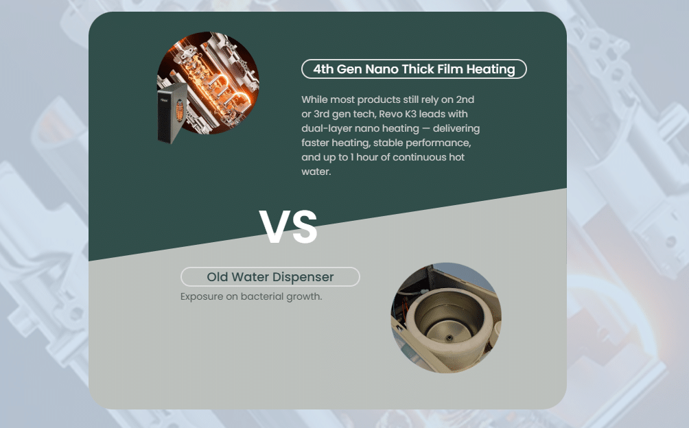 比较项目 传统水箱式净水机 智能直饮净水机 (如 Revo K3)
